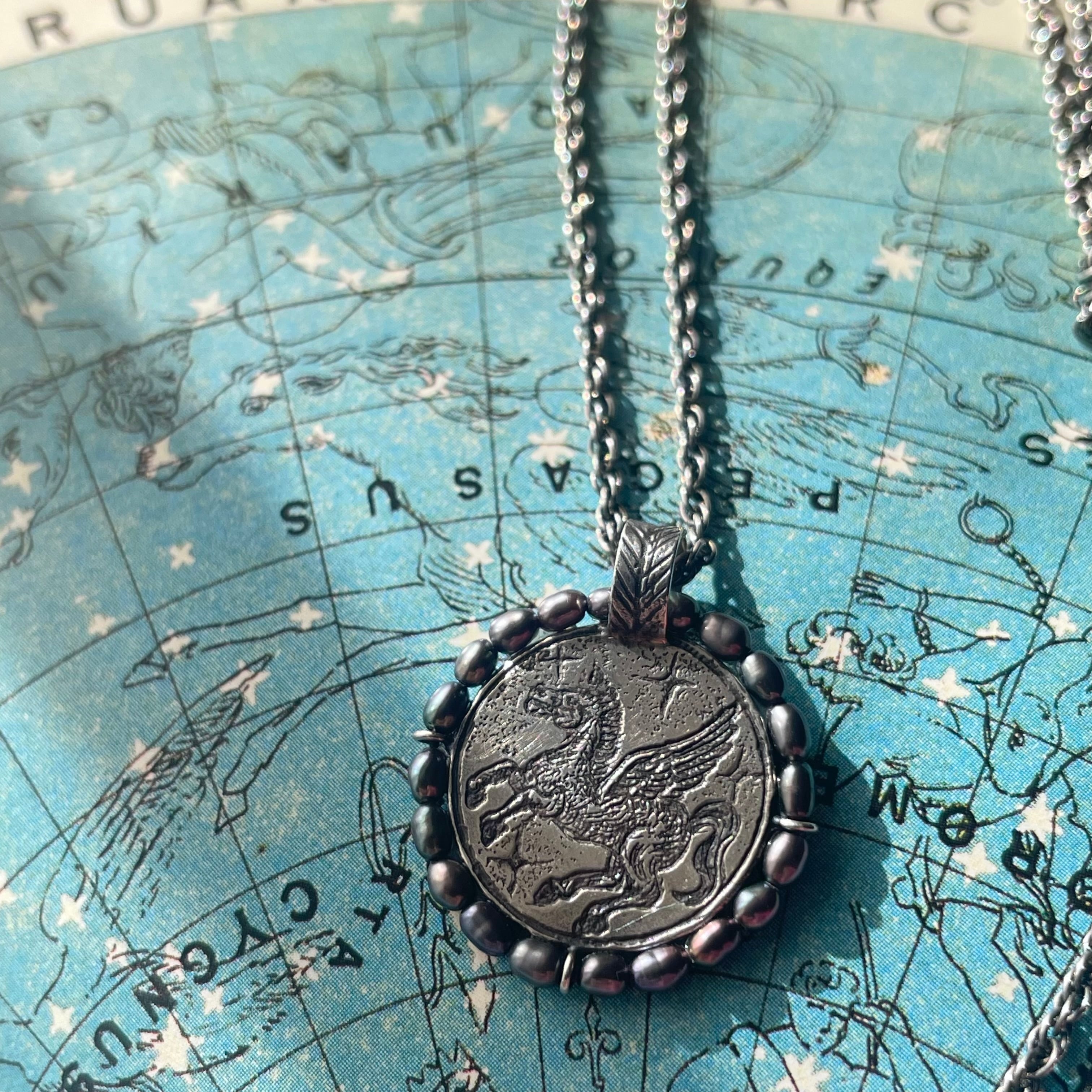 SV925 Etched Pendant -Pegasus(with Pearl) / シルバー製 エッチングペンダント・ペガサス(パール付き)