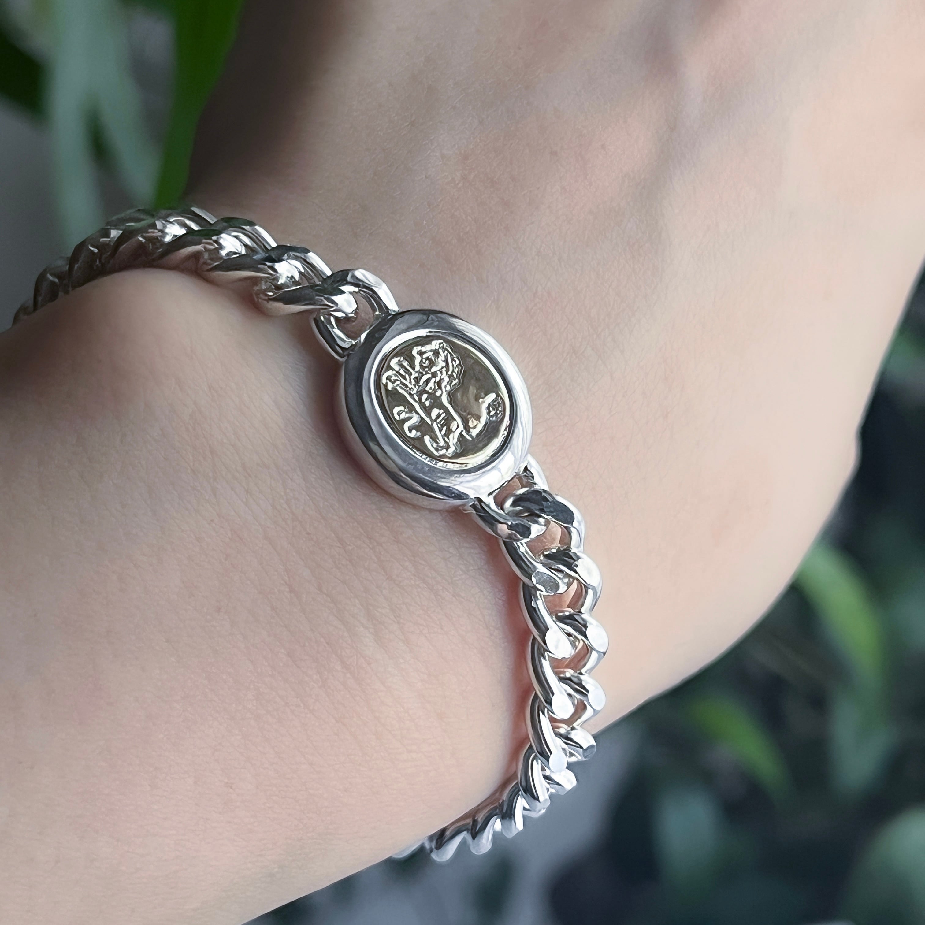 シルバー製のボリュームチェーンに、エッチングの技法を用いた星座のシグネットを組み合わせたメンズライクなブレスレット。ご希望の12星座と、サイズ*(S/M/L/LL)をご指定ください。