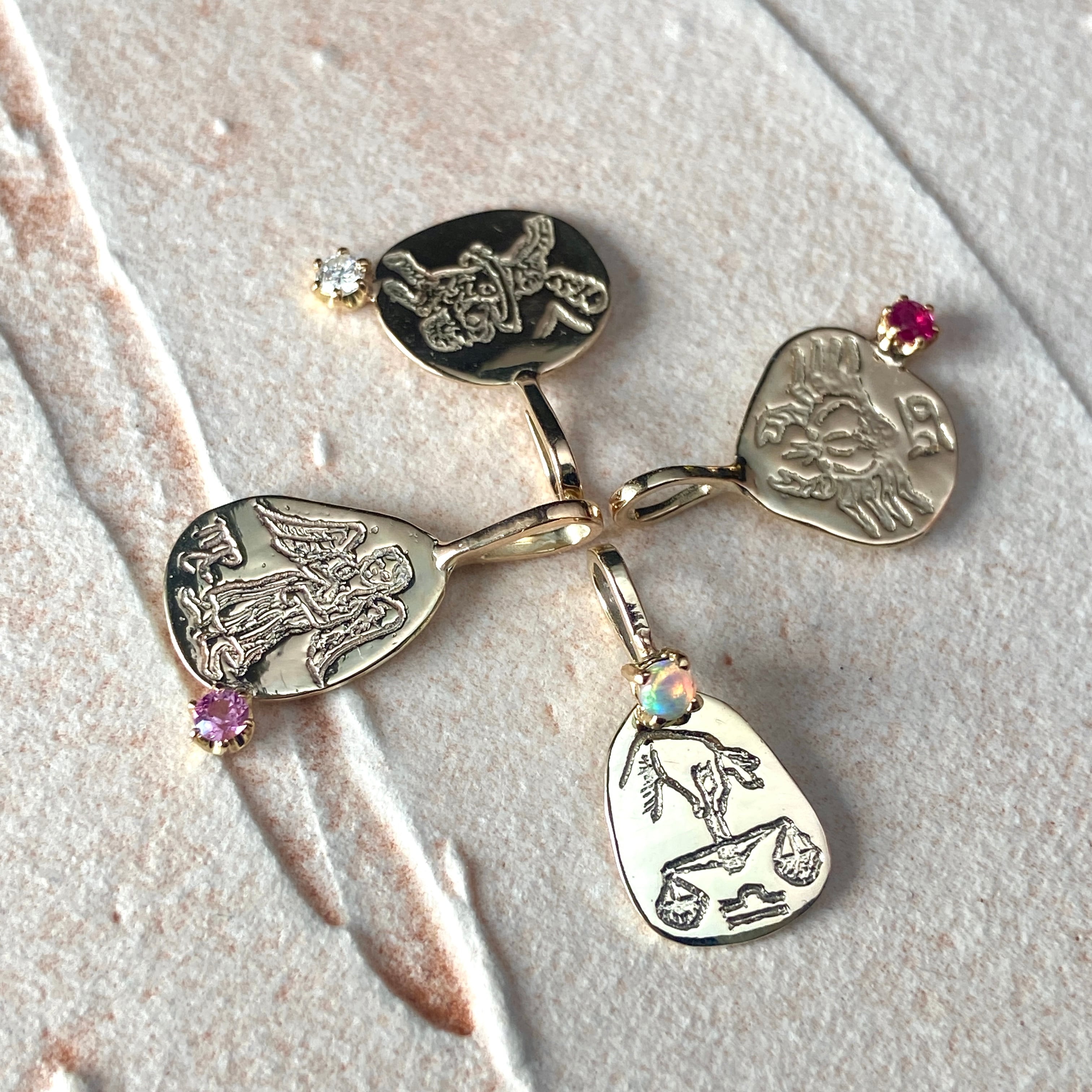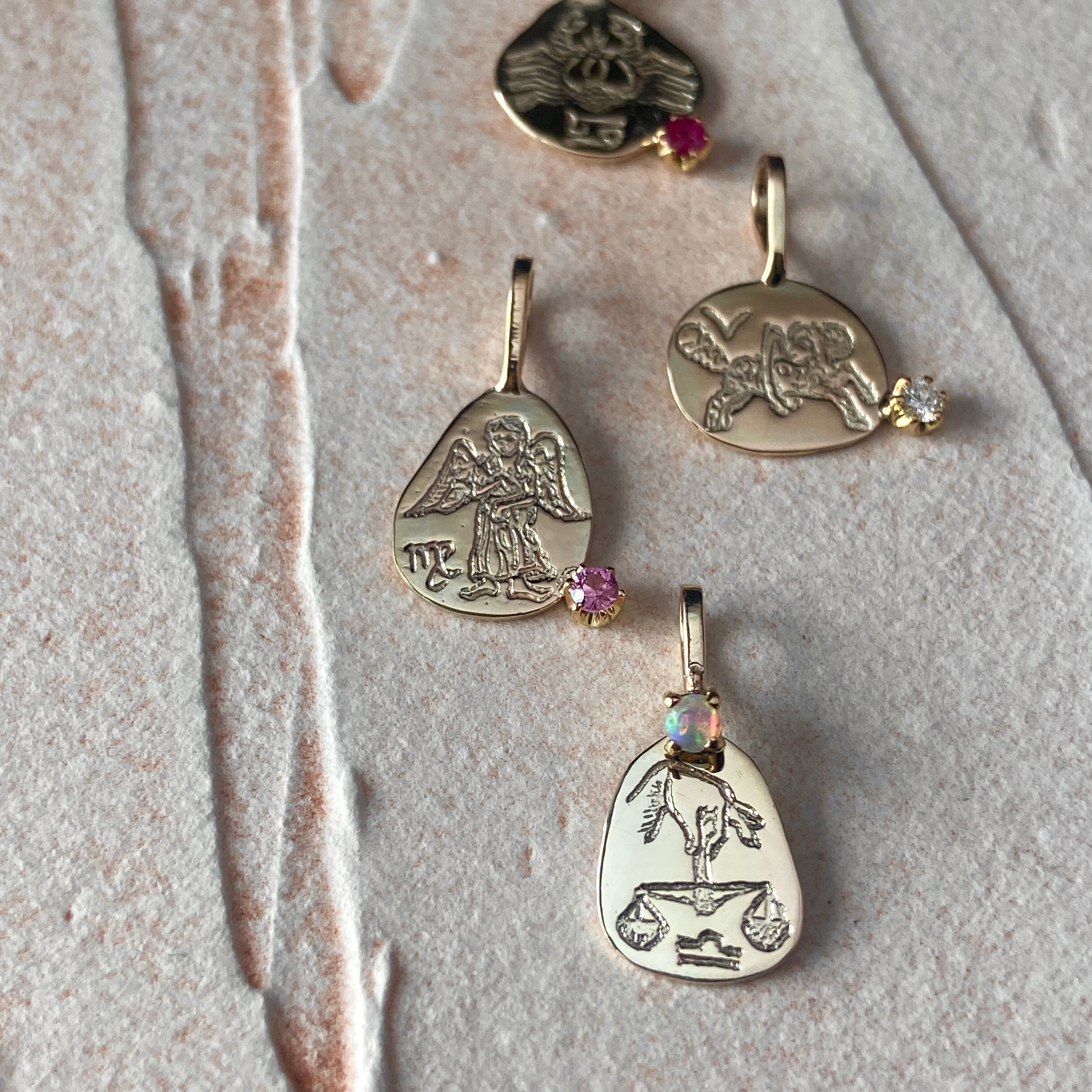 有機的なコインの形状は、12種それぞれの星座モチーフに合わせ形作っています。トップとバチカンが一体型で、様々なペンダントとの重ねづけにも向いています。毎日身に付けて頂けるお守りのようなペンダントです。