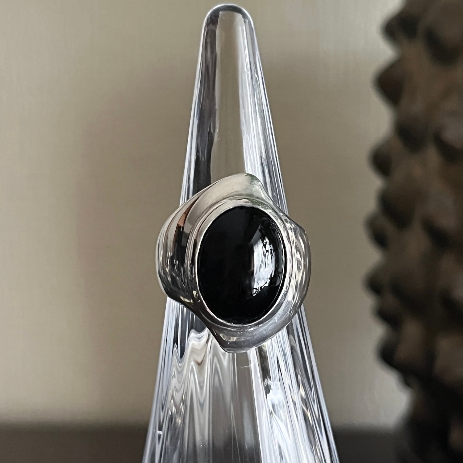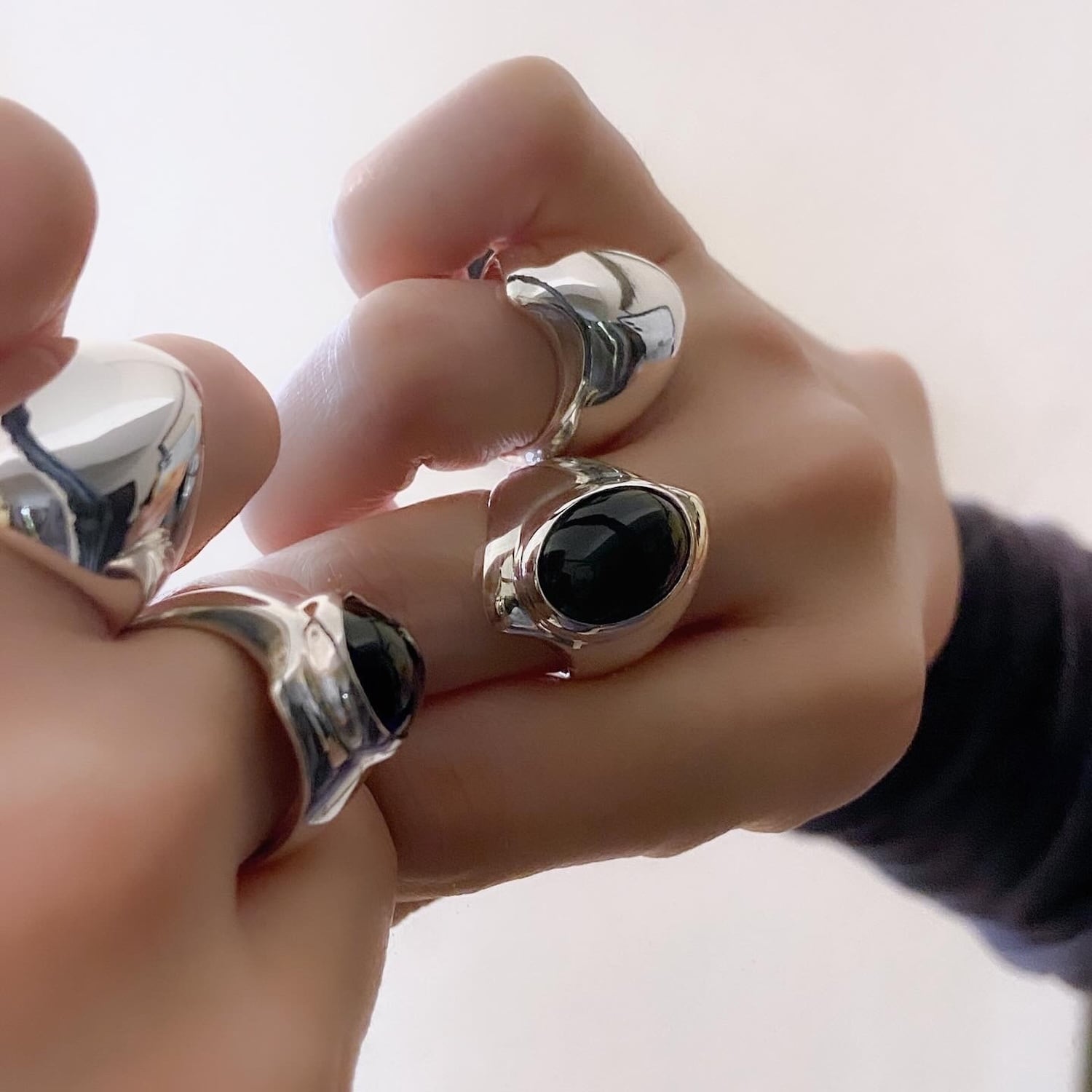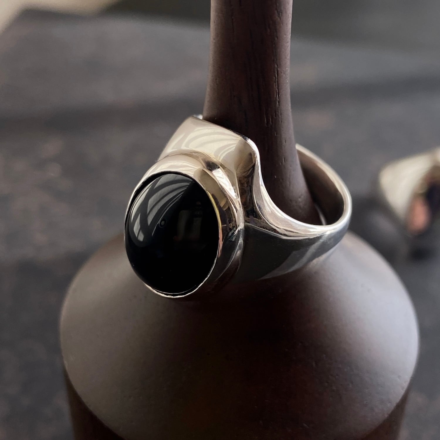 手指のラインに馴染みながら美しい流線型を描くオニキスのシルバーリング。ボリュームがありつつも着け心地はとてもなめらかで、指に負担なく着けて頂けます。ピンキーから人差し指まで、また男女問わず身につけていただけるデザインです。