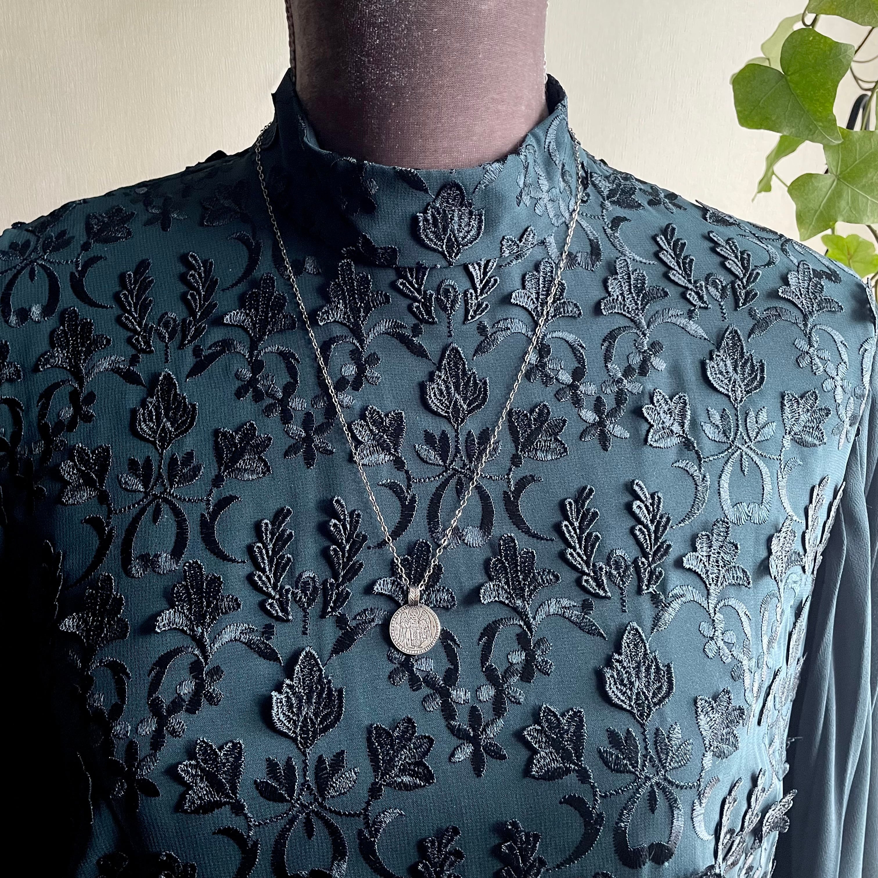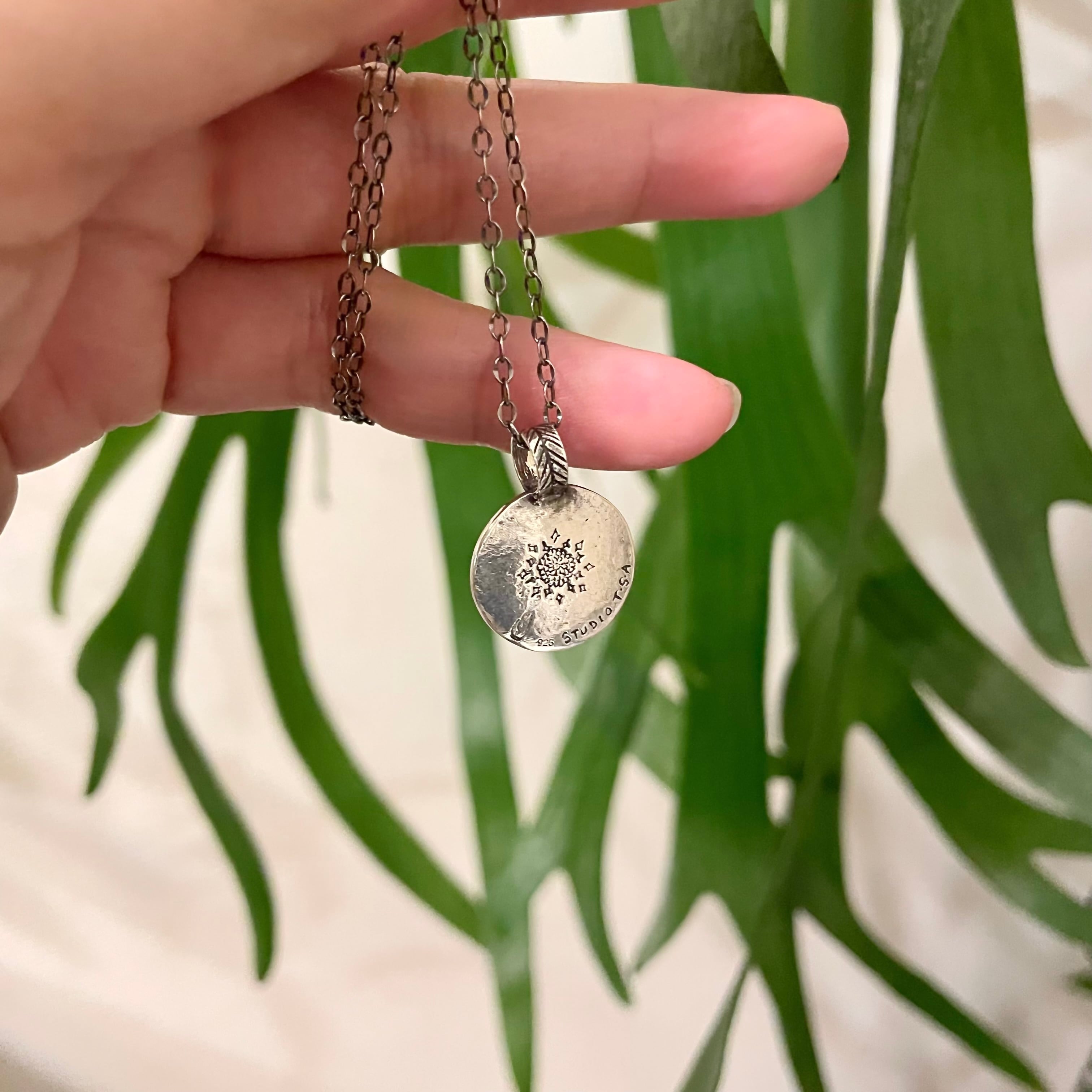 エッチングの技法を用いたペンダント。金属の腐食により生まれる味のある線は、小さな陰影を作り、モチーフに息を吹き込みます。