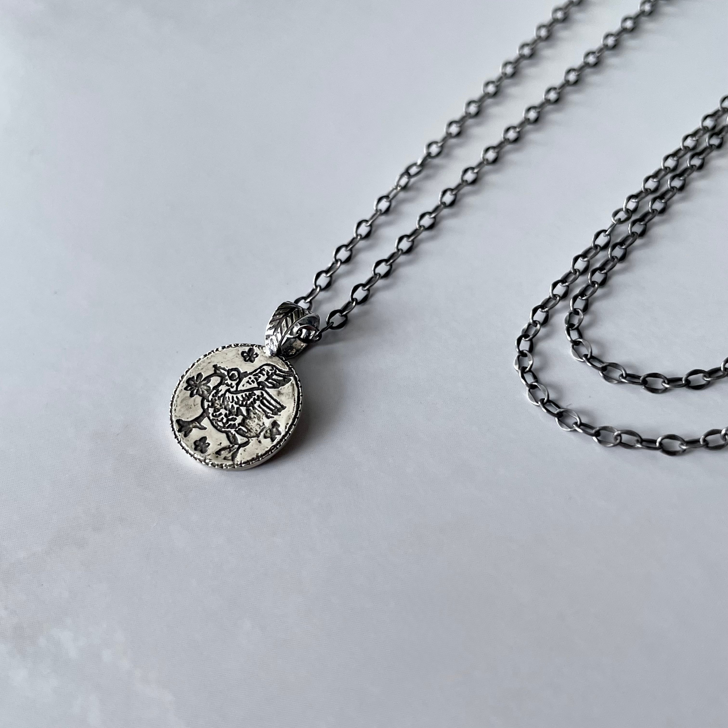 エッチングの技法を用いたペンダント。金属の腐食により生まれる味のある線は、小さな陰影を作り、モチーフに息を吹き込みます。