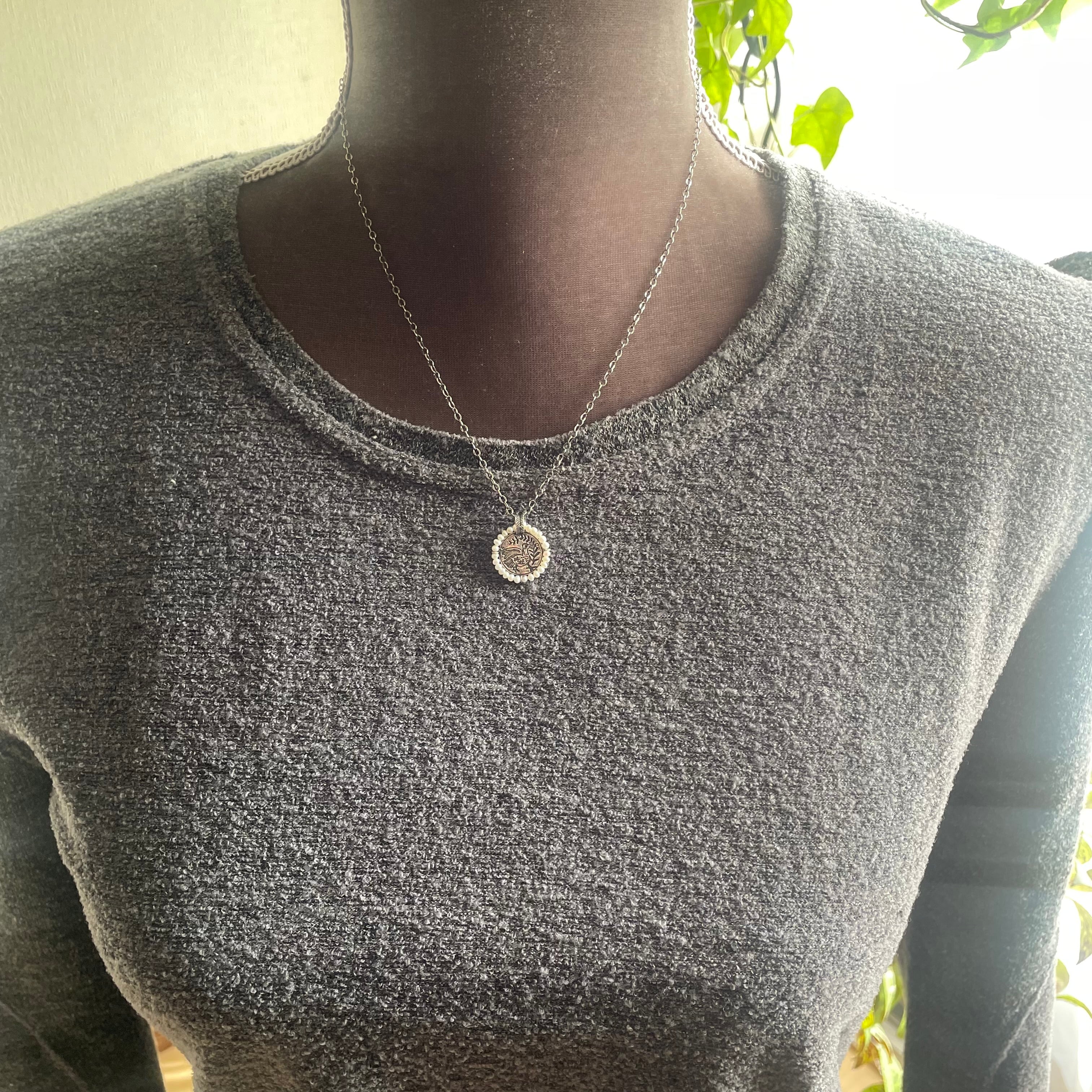 エッチングの技法を用いたペンダント。金属の腐食により生まれる味のある線は、小さな陰影を作り、モチーフに息を吹き込みます。