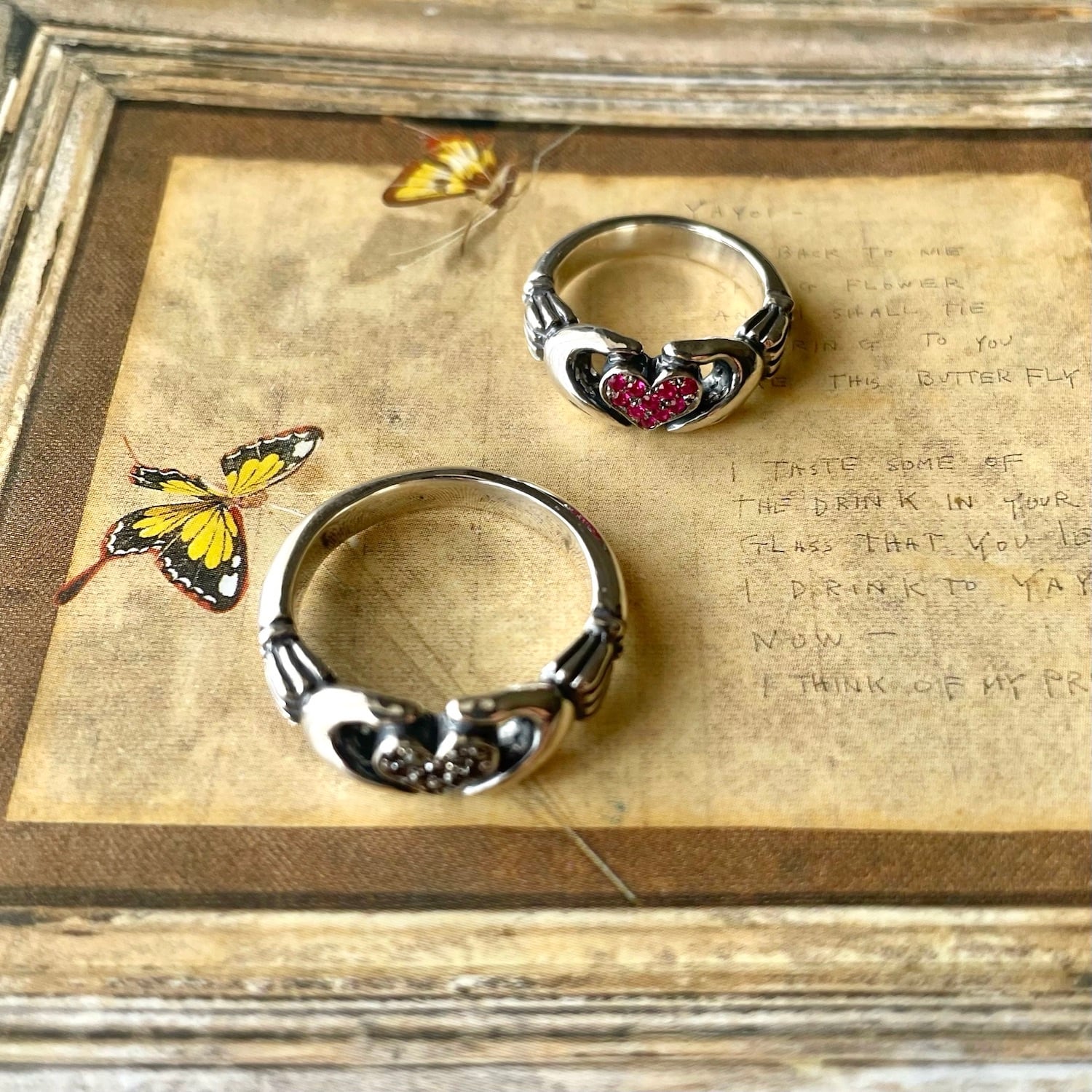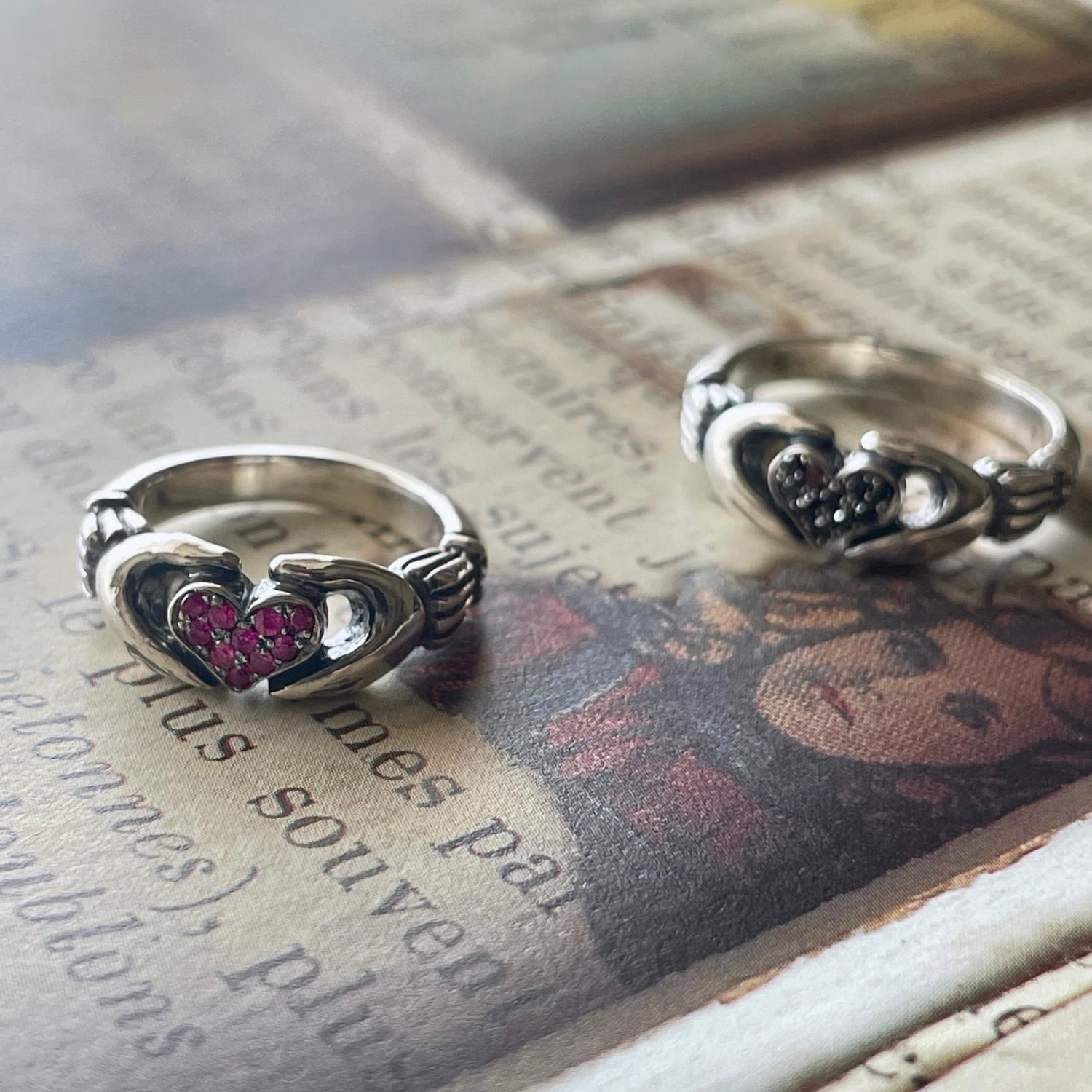 愛、信頼、誠実、友情を表す、お守りの様なメッセージリング。大切なものを慈しむ様に持った姿をイメージして、柔らかみのある優しく愛らしい手に、そっとハートを抱かせました。中央のハート部分には、選別した発色の美しいルビーを丁寧に石留めしています。素材はシルバー925製。表面は燻し、趣のあるアンティークテイストに仕上げています。