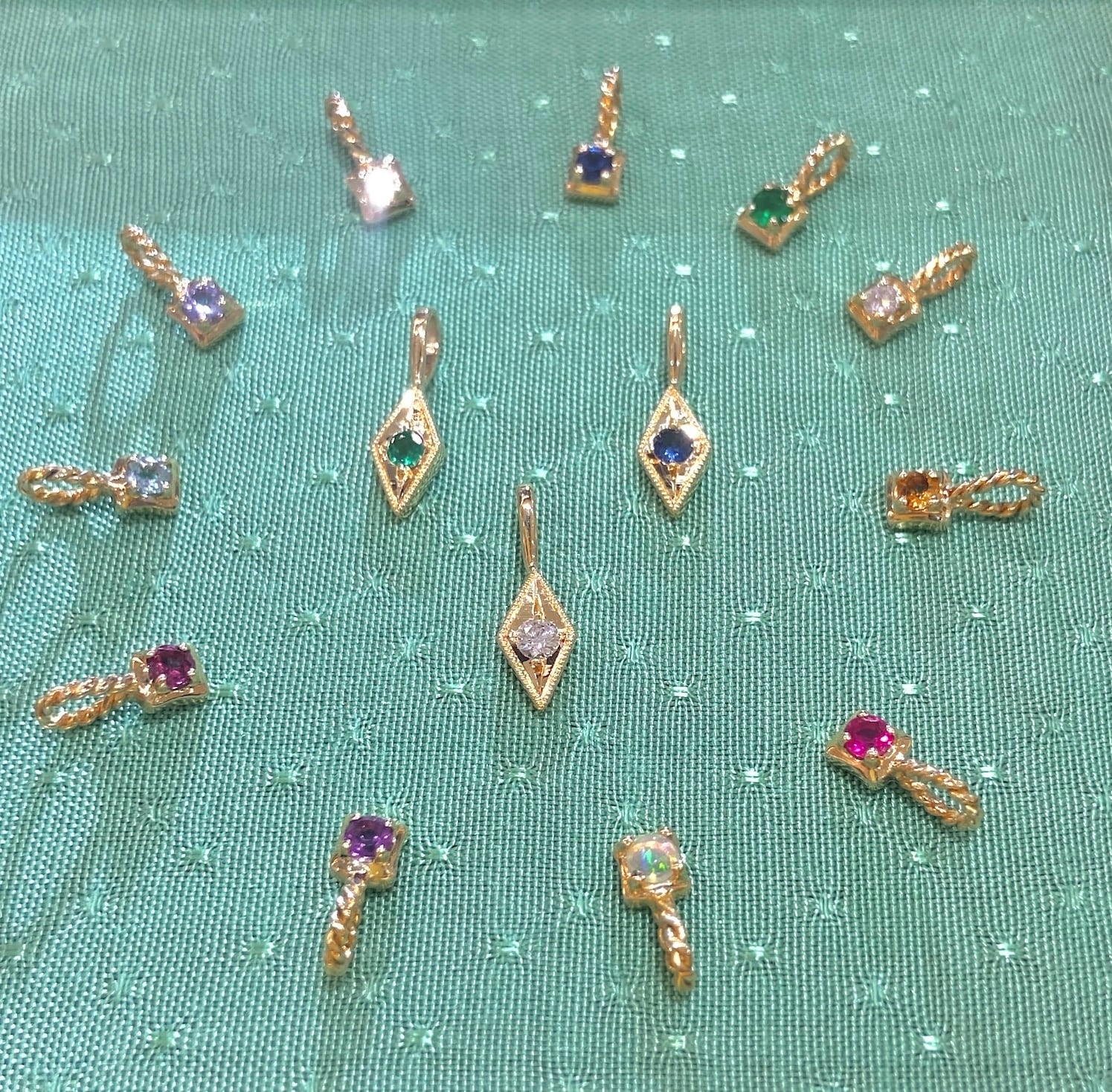 誕生石やお好きな石、14石からお選び頂ける丸みを帯びた四角が可愛らしい、18金製の小さなチャームから、只今即納が可能な石をセレクト致しました。