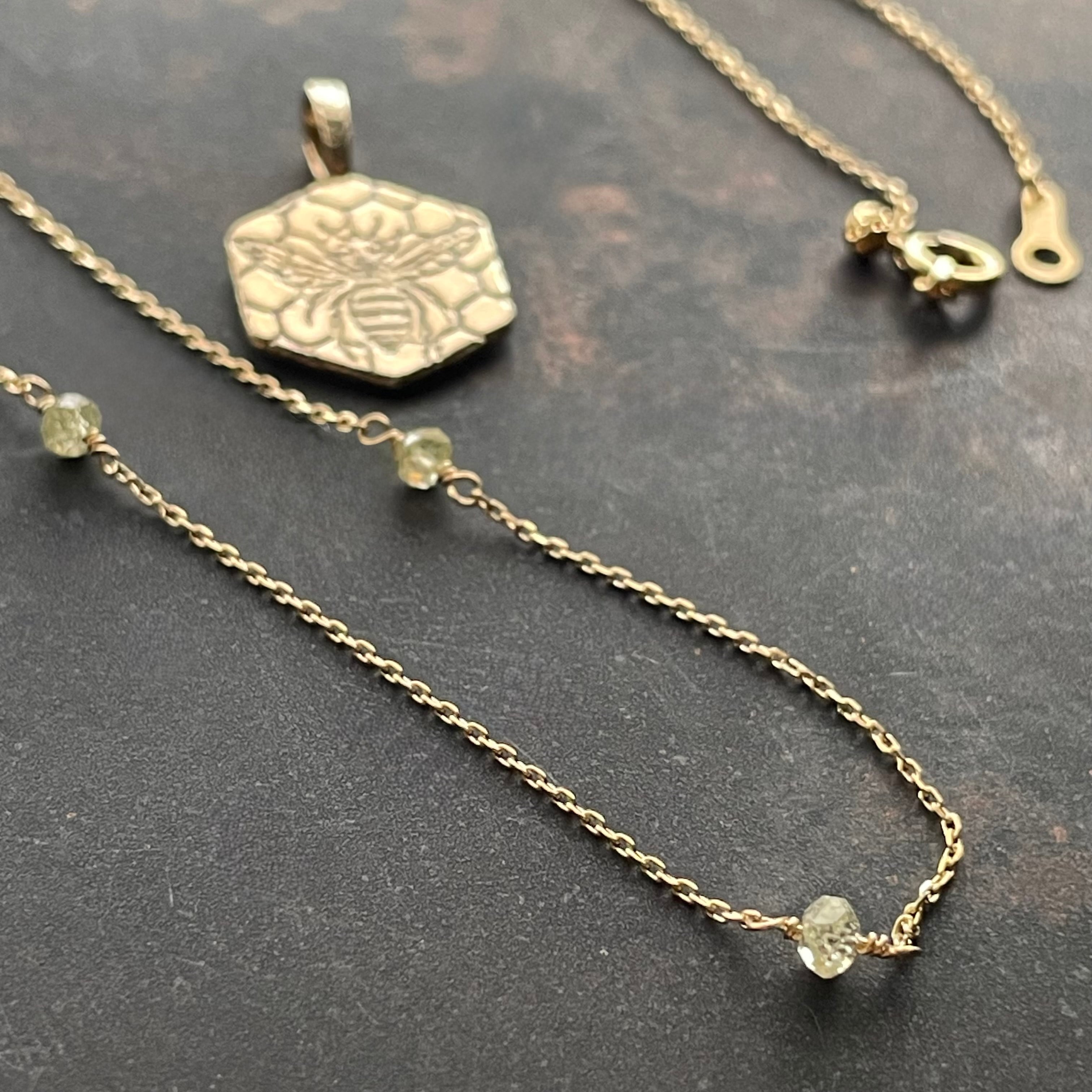 細やかなカットが施されたキラキラ輝く18金チェーンに、シャンパンカラーの天然ダイアモンドを等間隔に配したステーションネックレス。