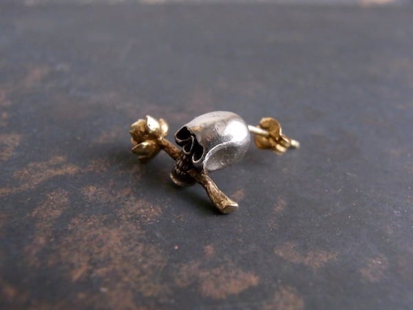 髑髏はシルバー925、薔薇とピアス金具部分は18金素材を使用。燻し加工を施し、アンティーク調の色味に仕上げています。髑髏好きも髑髏好きでなかった方も、きっと気に入って頂ける大人のピアスです。