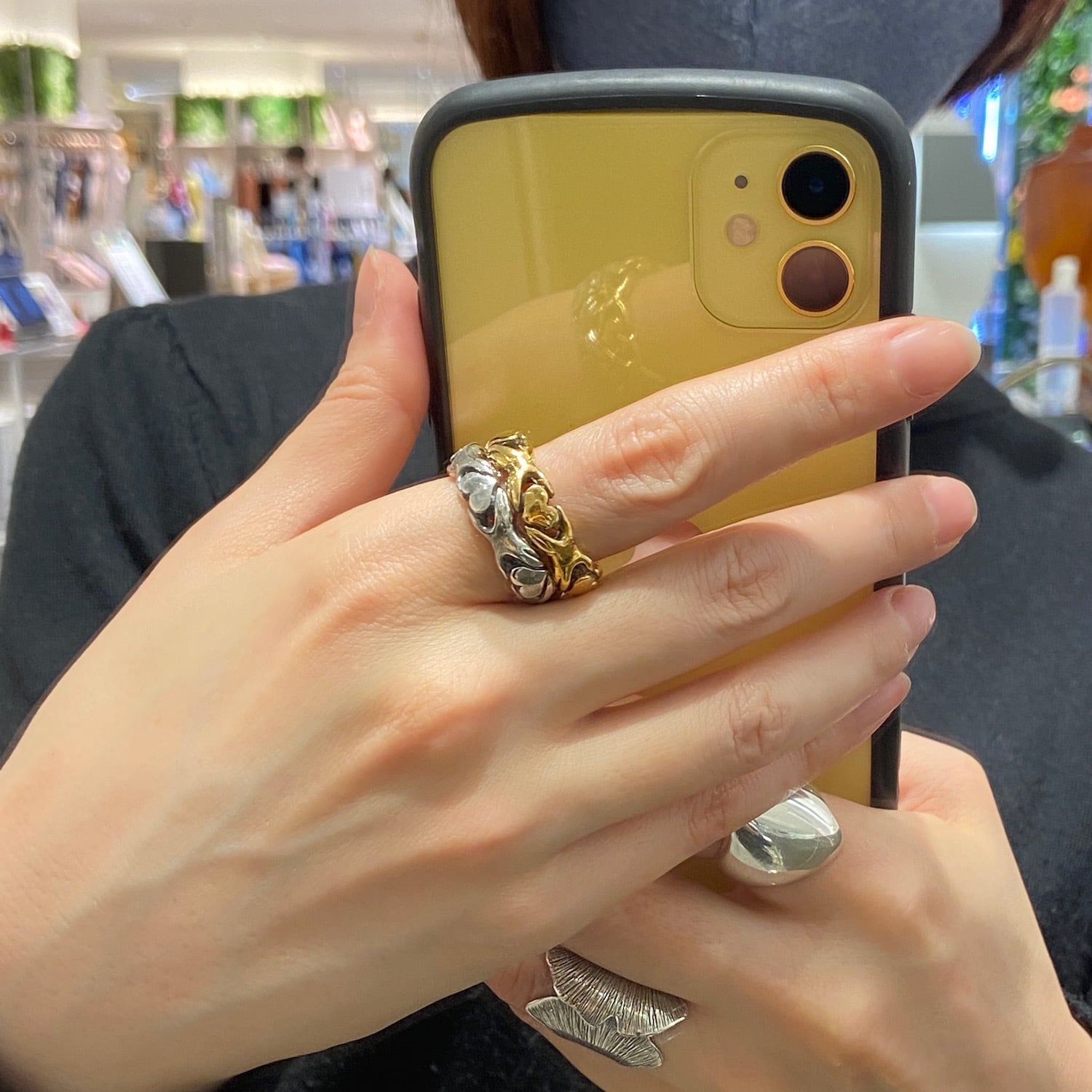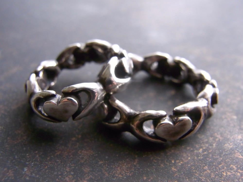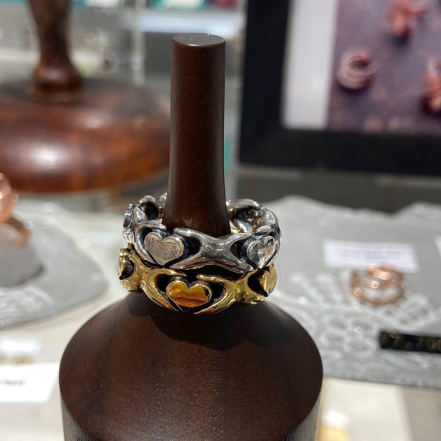 愛、信頼、誠実、友情を表す、お守りの様なメッセージリング。大切なものを慈しむ様に持った姿をイメージして、柔らかみのある優しく愛らしい手に、そっとハートを抱かせました。地金はシルバー925、または真鍮に20金メッキ掛けの2種。趣のあるアンティークテイストに仕上げています。ボリューム感のあるエタニティータイプは、ペアリングとしてもおすすめです。