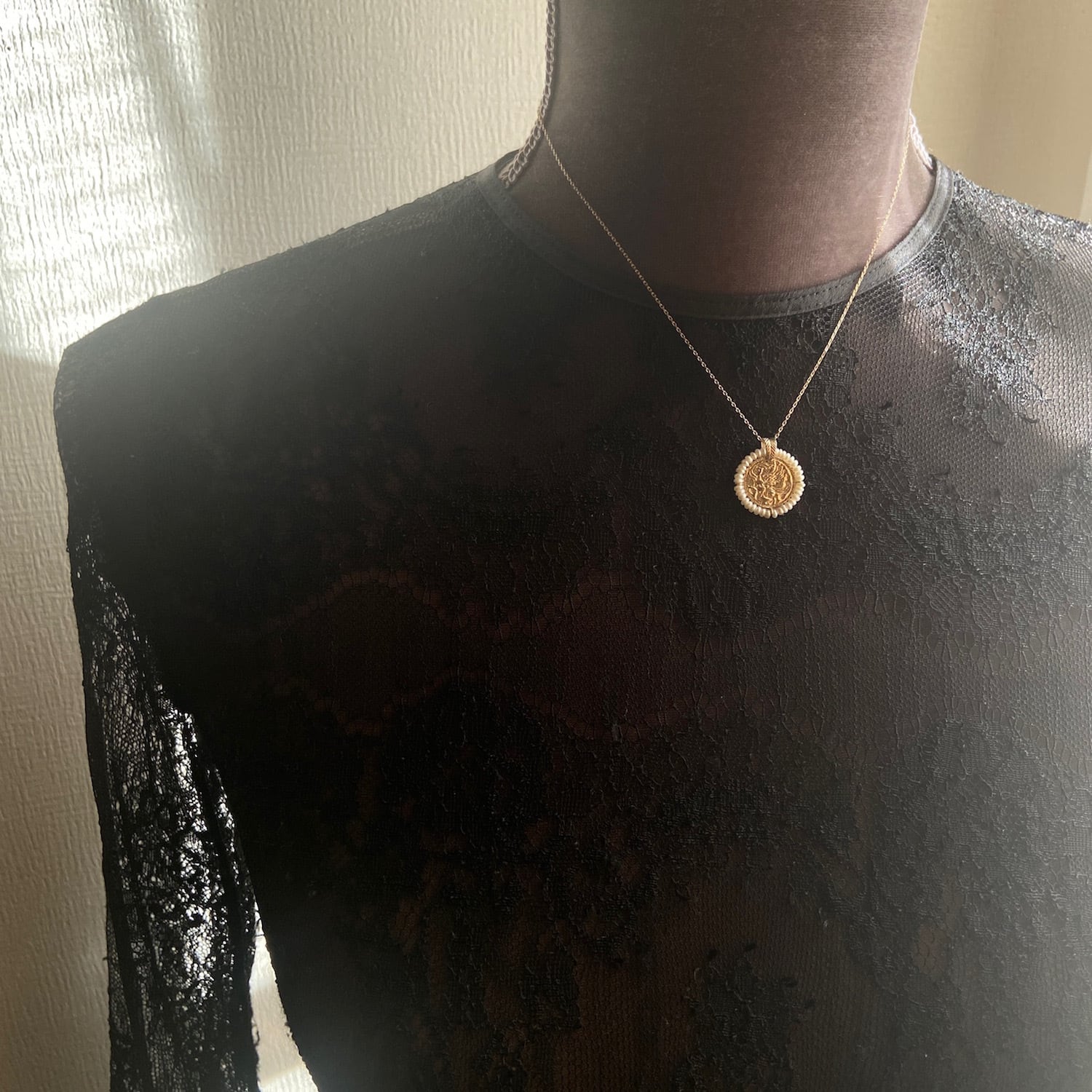 モチーフは海の魔物と言われるセイレーン。美しい歌声で、妖しく人を魅惑し続けます。コインの周りをパールや天然石が囲む技法は、ロシア正教のイコンからインスピレーションを得て制作しています。パールの他、ブラックスピネルもお選び頂けます。(石の雰囲気は写真8枚目ご参照下さい。)