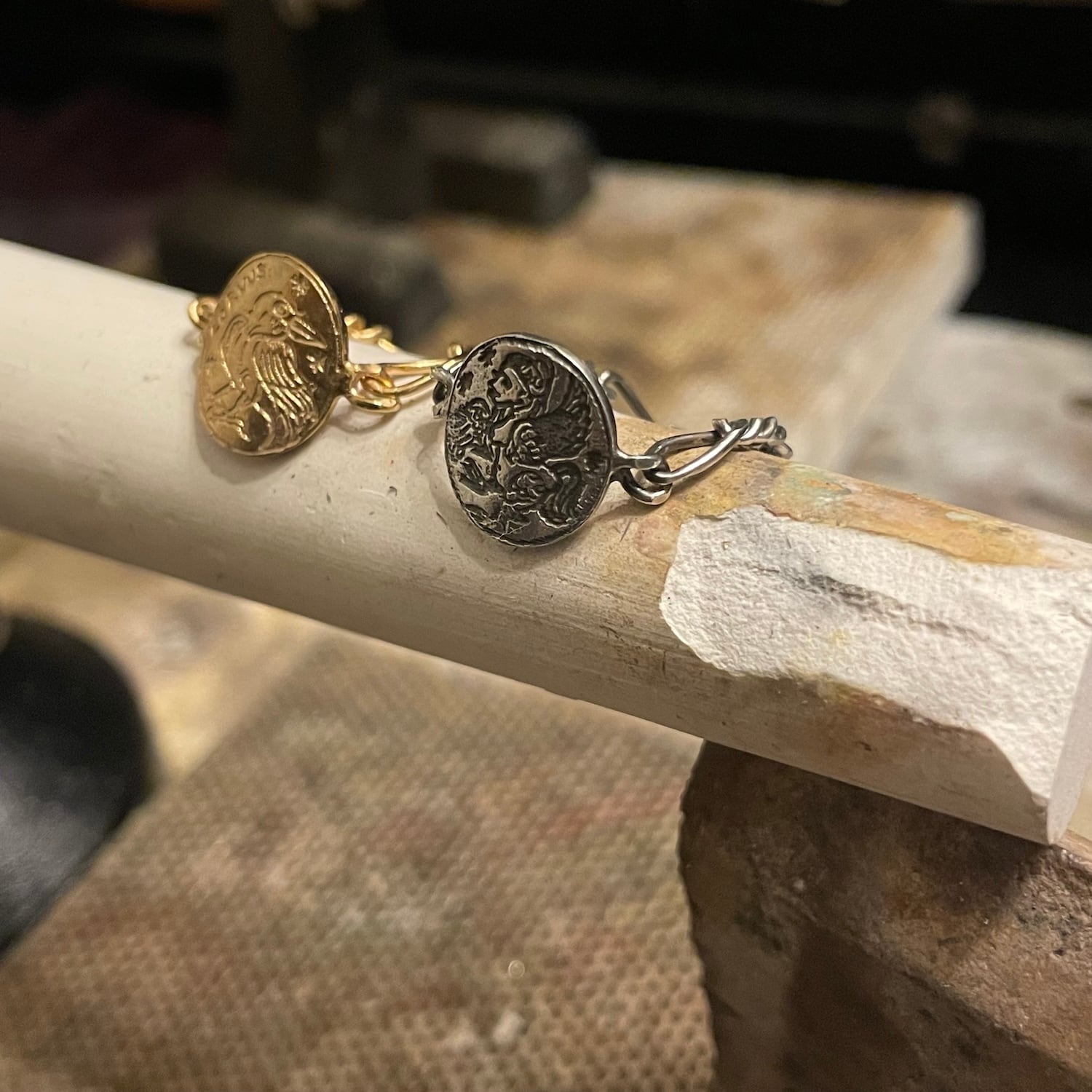 金属板にニードルでドローウィングしたものを腐食させ、細やかな凹凸を生み出すエッチングの技法を用いたコインモチーフリング。身につける人それぞれが描く物語の中で、神話や伝説のモチーフたちは、時にお守りのようにそっと寄り添います。
