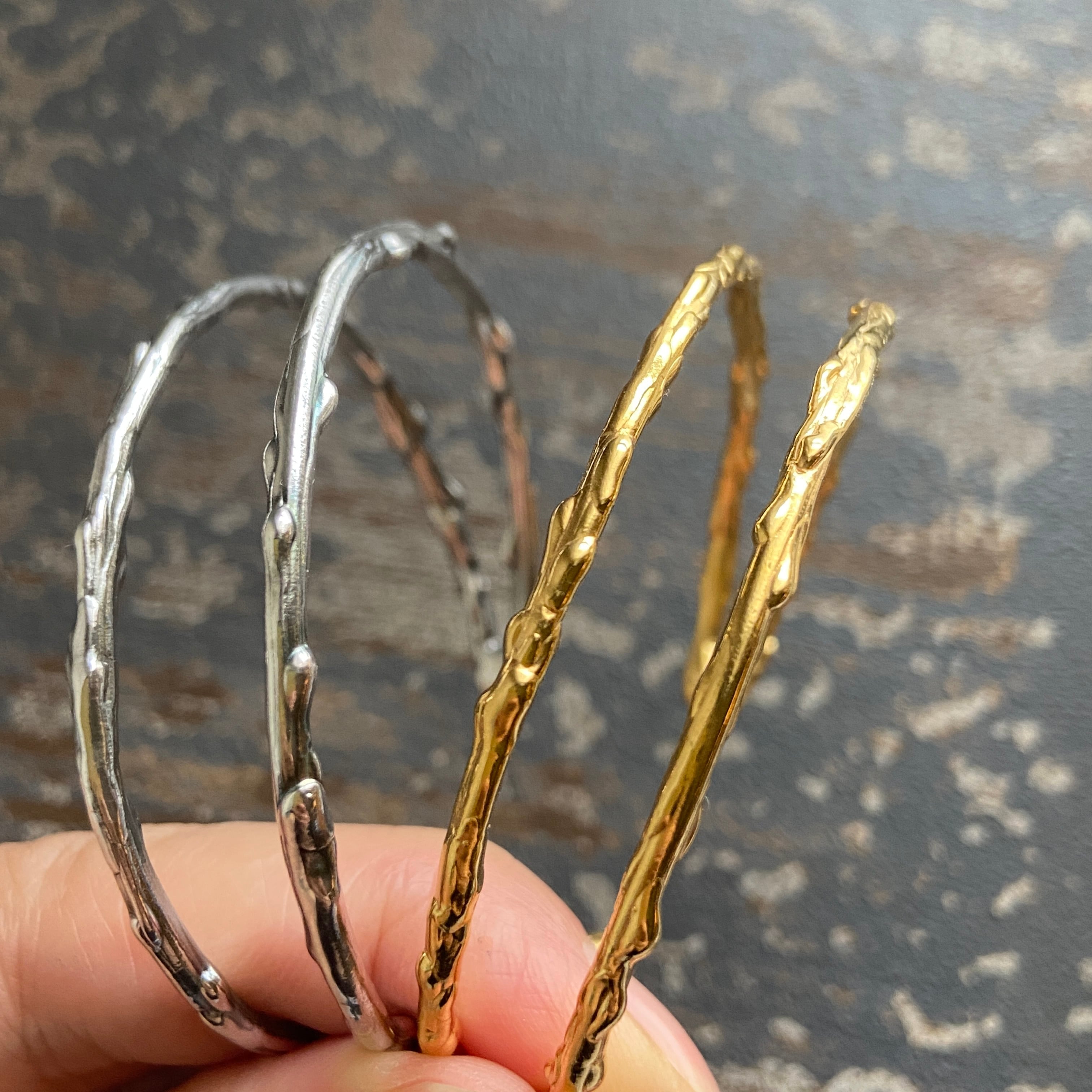 蝋が溶けたような有機的なテクスチュアのMELT(メルト)の2連バングルと、蔦が緩やかに交わるようなイメージのTWIST(ツイスト)バングル。シックな燻し仕上げです。