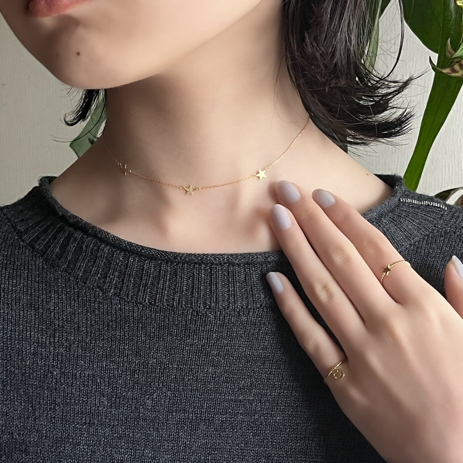 星の表面には少しマチエールがあり、ポップになり過ぎずエレガントなスキンジュエリーとして身に着けて頂けます。星の付いたテールが揺れ、後ろ姿もとてもチャーミングに見せてくれるネックレスです。